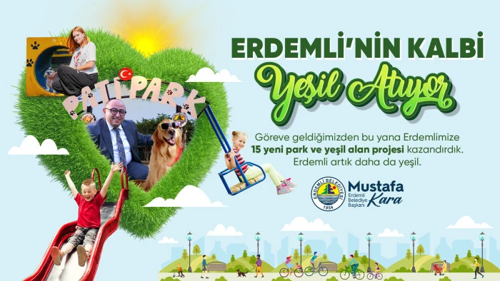 Erdemli Belediyesi tarafından hayata geçirilen projeler kapsamında, Başkan Mustafa Kara’nın göreve gelmesinden bu yana ilçeye birçok yeni park ve meydan kazandırıldı. Bu çalışmalar arasında; Rıfat Coşkun Cüceloğlu Meydanı, TOKİ Meydanı, Pati Park, Mustafa Yorulmaz Parkı, Pumptrack Bisiklet Parkı, Sarıkaya Mahallesi Parkı, Tozlu Mahallesi Parkı, Akdeniz Meyve Bahçesi, Alata Meyve Bahçesi, Kuşluca Mahallesi Parkı, Kelsorti Mevkii Yeni Park, Koyuncu Aybala Sokak Parkı, Alata Anaokulu Parkı, Erdemli Özel Eğitim Anaokulu Parkı ve Toros Mahallesi Erkek Kur’an Kursu Parkı yer alıyor.
